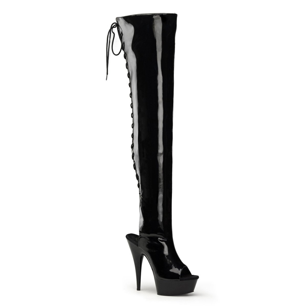 DEL3017/B/M jsou odvážné černé kozačky pro dominy s otevřenou špičkou a patou s vysokým podpatkem a platformou, které končí vysoko na stehnech. Vysoký podpatek a široká platforma vytvářejí ikonickou siluetu pro dominantní roleplay, erotické příležitosti nebo večery plné vášně. Díky šněrování po celé zadní straně si je upravíte přesně podle postavy.